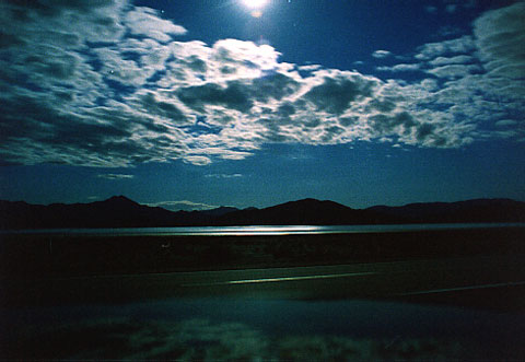 It's Artichoke time again Art writes: This is a one in a million picture taken early Sunday morning, March 11, 2001 as Ramona and myself returned from the Radio and Records Talk Seminar in L.A. it was taken between Baker, CA and Pahrump, NV at about 5:30 AM. In the distance you can see about 2 or 3 inches of water covering the desert, lit by the moon. The reflection of the clouds at the bottom of the picture is my Trans AM where the camera was resting for the long exposure. THE DESERT OF THE SEA
