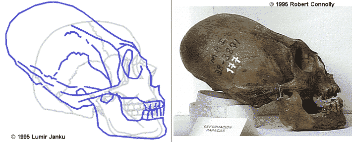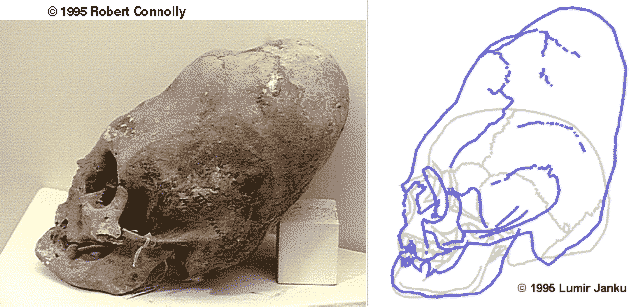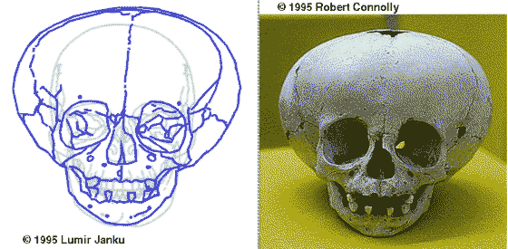 Three pictures of skulls of unknown origin, compared with modern human skull,