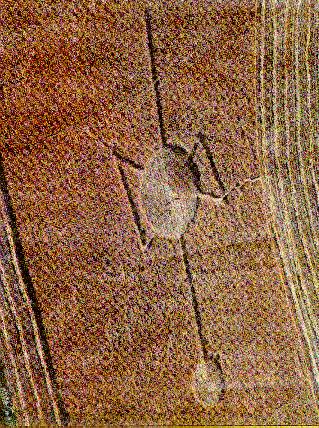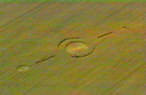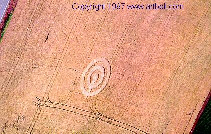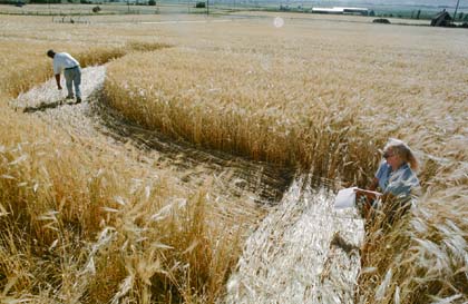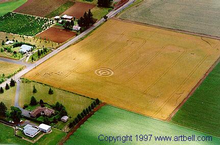 (courtesy Salt Lake Tribune) This design is 240 feet long - It was found on Friday - August 23, 1996 by an 81 year old farmer in Logan, Utah on his wheat farm. His name is Seth Alder - while harvesting his wheat crop - his tractor broke down - so he began walking out of the field for help and came across this strange glyph. He contacted the Cache County sheriff's office and an investigation was begun. The local airport in Logan sent a plane over the field and picture/video cameras were used to capture this unusual glyph. After the investigation was completed - it was decided that it was made about a month earlier - when the wheat stocks were still green. One sheriff deputy said that maybe it was the work of gophers. There was no sign of anyone having walked in the field - as no wheat was found to be broken or stepped on - any place around the glyph. Click Here for Previous Page |