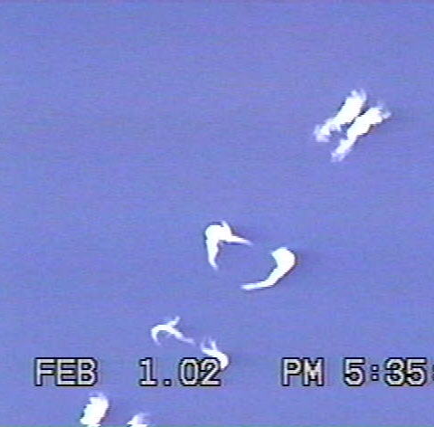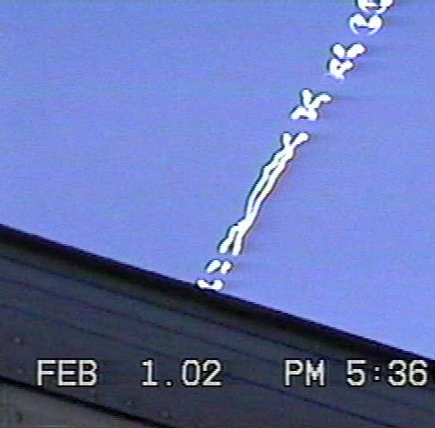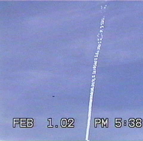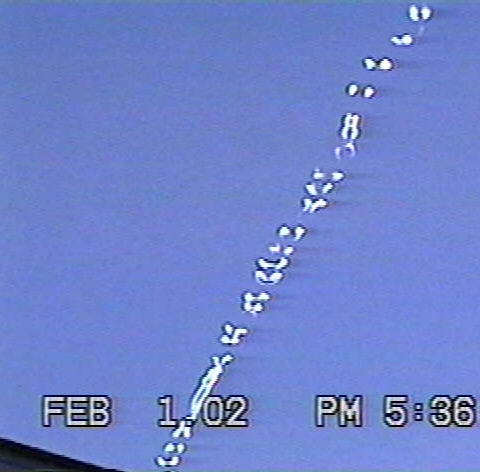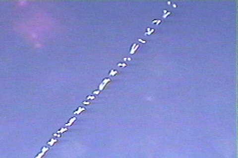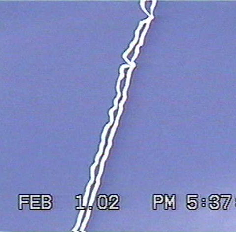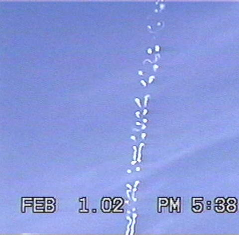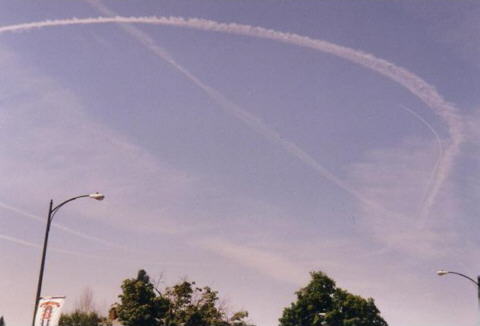 Doug McGinnis (shakyamuni@webtv.net) sends us: On Feb. 1 2002 while in Saginaw, Texas I noticed a contrail being laid at a low altitude by a "craft" travelling south. I could not see any discernable aircraft. The contrail itself exhibited an odd behavior, in that portions of the trail disentegrated rapidly, while other parts lingered, almost as though it was being shredded from within. It showcased a sort of "symbol" form as it dissipated, lasting for only a minute or so. There is much chemtrail activity out here in Saginaw (where I work), and Westpoint (right down the road from Lockheed-Martin) where I live. And I learned about contrails on the Art Bell show! Hope you like the pics!