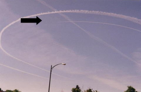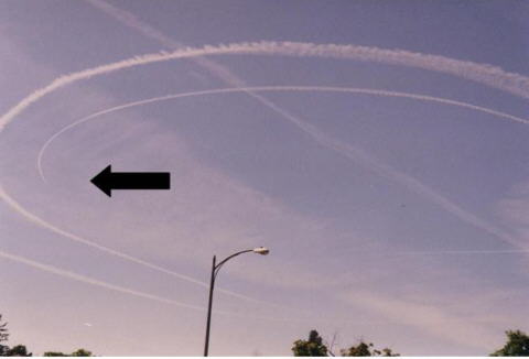 Jeff Borer (nsujeff@hotmail.com) sends us: I took these photos at a Fisher-Price parade for children in East Aurora, New York last August. The day started with pristine blue skies. You can see that the straight chemies were laid first and followed by the spiral laid out next. Why "they"would do this with thousands of kids in the area I don't know. My kids asked me why the "airplanes"were doing donuts in the sky." They thought it was part of the show, but we know better don't we......
