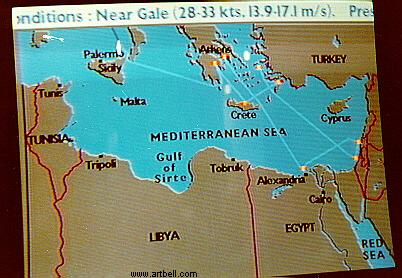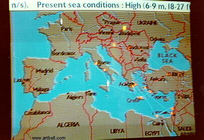 A couple of shots of the on ship television monitor, reporting the near gale force winds they endured.