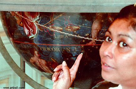 Ramona points out her astrology sign, on a globe at the Vatican!