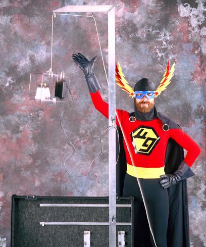 A rare photo of Mad Man Markum, displaying his Anti-Gravity experiment.