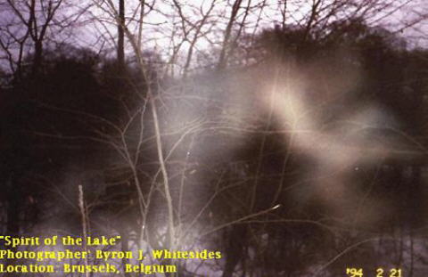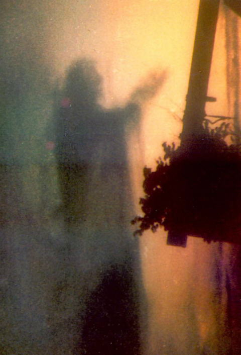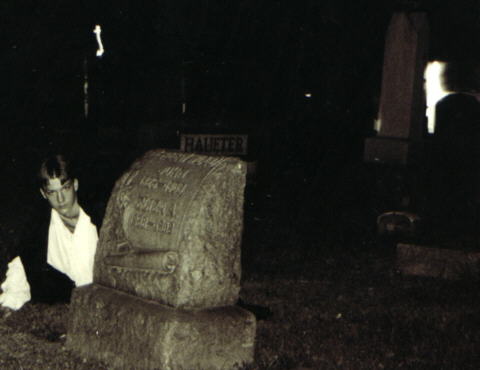 Brian Burress, Lorain,Ohio writes: This past summer my wife Laura took our nephew Brandon (the young man in the picture) out to Elmwood Cemetery here in Lorain, Ohio to do a photo shoot. When the pictures were developed she noticed the anomaly in the upper right hand area of this photo. It is neither a lens flare nor is it a reflection and it only appeared in this picture.. It was around midnight when this photo was taken, so there were no other cars or lights nearby in the cemetery. I have zoomed in on the figure many times, and have noticed that its aura seems to be wrapping around the tombstones in that area.