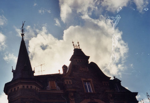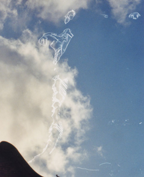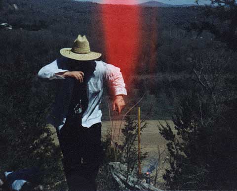 Thunderhead writes: October first 1999 my closest friend and his six year old son were killed in an automobile accident. My friends widow also a very dear friend agreed to a send off of of their ashes in an arial display of pyrotechnics. I loaded a morter with about two pounds of black powder and mixed their ashes with fireworks that made a beautiful display of an amazing column of fire and smoke, fireworks and a huge perfect smoke ring. (we have lots of acreage out in the country) This photo however is just a moment before the blast. I have lit the fuse which you can see burning just behind me. I am a professional photographer and cannot attribute what is in the photo to problems in the film or processing. It seems like I am running right through the ectoplasm. Don't know why my face is missing either. Neat hunh?! The widow is now happily married to my best friend.