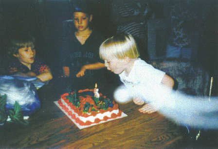 Lew Jones (lew@kc.rr.com) sends us: The boy in the picture was having a birthday party a few days after his grandfather (my uncle) passed away. His mother was taking pictures, and after they were processed this (what we belive is the ghost of his grandfather) appeared on some of the pictures. ![]()
