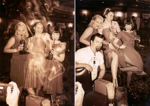 Hunter Kinsey (Hunter@HKPhotography.net) sends us: In April I was at the Gold Coast Casino for a 4 day rockabilly event, and I was taking a picture of some of my friends. In the first picture, where it is just the girls, there is a "plasma" surrounding them. In the second picture that was taken no more than 5 or 10 seconds later, where a male friend got in the shot, the "plasma" is gone. Maybe it did not like the male energy. Let me tell you a few things here: 1) I am a commercial photographer, and I have always been leery of "plasma" pictures. 2) In over 12 years of shooting for a living, I have never gotten anything like this on film, either in my professional stuff, or my snapshots like these. At first I thought is was a weird light leak. I checked the negative, and the "plasma" does not go outside of the image on the neg. It is cut off at the edge, so it was in the picture. 3) If it were smoke from a cigarette, it would have been more hazy, going in one direction, and a lot less of it, and it would have been in the next shot, as there is no way it would have dissipated so quickly. ![]()