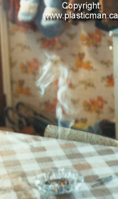 Eric Spottke (eric@implex.net) sends us: I downloaded some pictures from my camera today and think I have captured the image of a ghost. This is the same location (Afton, MN) where one of the grounds keepers was struck and killed by a drunk driver last year about this time. I think I can make out a rake or some other implement in it's hands. ![]() Carol Wightman (cosmic@pe.net) sends us: Faces in smoke are real and are very familiar to me. As a matter of fact, what I do is take pictures of these and many other similar phenomena. They are not just imagination. They are known as elementals, nature spirits or devas. I have many interesting pictures of the same type on my website at home.pe.net/~cosmic if you would like to see what I have photographed along these lines and read an explanation of this phenomena.