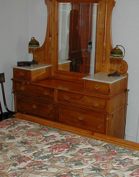 Avon Leonard (ApsychicMoon@cs.com) sends us: I was staying in a room at the Jackson House Hotel in Eureka, NV. The hotel is famed for the ghost of a woman, that is seen in the hotel and the bar downstairs, in the same building. I was taking some pictures of the historic room I had rented. When I got home, I saw this picture. I am a large woman and as you can tell by the camera angle, the shadow is not mine. I tried diligently to recreate this effect and could not do it. I have shown this photo to the officers in the Eureka Sheriff's department and they were quite amazed. ![]()