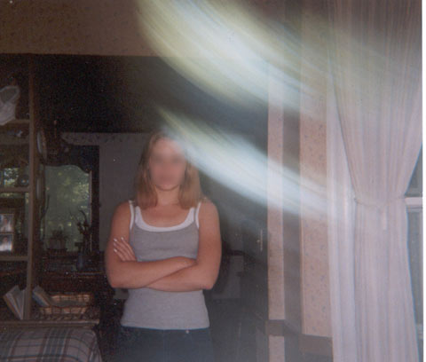 Delaney also sends us: The second photo was taken with a disposable camera. A year prior to this picture her mother died in the same house. The picture was from the doorway of her mother and father's bedroom. We believe this picture to be a manifestation of her mother's ghost. Please obscure the girl's face. ( Webmaster: We Did) ![]()