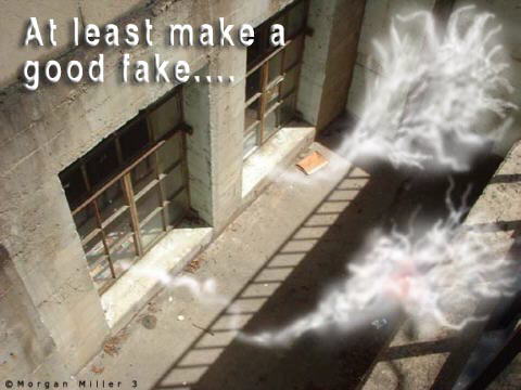Jason (mrfields@airmail.net) comes back with: It's easy to do this one.... the person who submitted this first started with just white on the airbrush tool in PhotoShop with a low pressure (around 5%) and stroked out all the the lines then he probablly increassed the pressure a little to get the heavier lines or simply restroked them with the air brush tool...then you can add a layer and use a bigger brush with about the same pressure to make the glow...i went back and used the eraser with the airbrush and added a little to the middle for a little extra...i spent a grand total of MAYBE 4 mins on redoing the same effect in the top portion of the photo... I sent you this hoping you will post it on the same page this guys photo is on...that way everyone can join in the fun and make their own ligitimate fake photo...