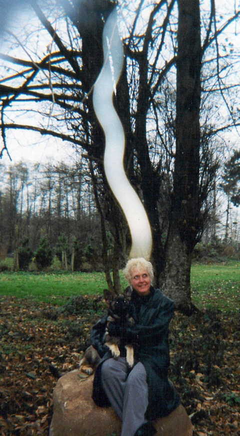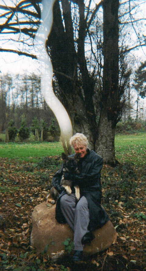 Denice Krueger (denice@avrioshepherds.com) wrote: I raise and train German Shepherd dogs. One November 12, 2000, I went to Aldergrove, BC, Canada to visit a friend who had some puppies she wanted me to see. We took pictures of a few dogs with different people, a total of two rolls of film. I was thinking about buying the puppy in the picture and so we decided to take some pictures of me with that puppy. Later, when I got the pictures developed I just glanced at them and then put them away because I had decided not to buy that dog. Most of the pictures were of other people with other dogs. My son had also looked at the pictures when he picked them up for me. Neither of us noticed anything at all unusual about them. At the end of December 2000, we went back up to the same friend's house in Canada. I decided to take the pictures along to give them to my friend so she could give the pictures to the new owner of the puppy. I had no use for them. At the last minute, I decided to look through them one last time for some reason. That's when I noticed that four of the pictures out of two rolls had this white light. The pictures were not right next to each other on the negatives. There were pictures in between that did not have this light in them. Here are two of the pictures. I had the pictures and the negatives examined by a film expert who used to work in film analysis for the government. He had no explanation for what the light could be. He said that a hair would be refractive and that you would not be able to see through it like you can this light. In the first picture, the dog and I are looking up for some reason. I have no memory of anything strange while we were taking the pictures. Any ideas?