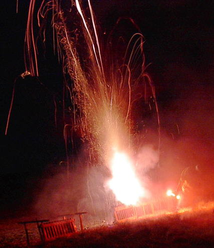 John Simpkins (pyroglyphics@msn.com) sends us: I took the attached photo on Saturday, January 26, 2002. The photo was taken at a fireworks shoot for the Ohio Pyrotecnics Arts Guild in Waverly, Ohio. The photo is of a pyrotecnition igniting a fireworks shell. The photo was taken at the instant that the shell was exiting the mortar tube. At the right side of the muzzle flash, there is an area of smoke that looks like the Devils head. Very similar to the Devils head which appeared in the smoke at the Twin Towers disaster on 9-11.
