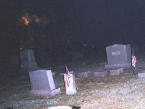 Joe Torres (reikijoe@hotmail.com) writes: We hunt ghosts in Southern New Jersey and took this photo with a 35 MM Olympus (we have the print and the negative.) Until last weeks show on Mothman, we called it "creature" for lack of a better name. Is this Mothman? Is this what people in South Jersey label the "Jersey Devil?" Is it one in the same? Time will tell. P.S.: In the background is our car, but that guy above the headstone...well, that's another story! We have many photos posted on our website, evps and video clips too. We're not looking to plug the site, I only mention our website so you may witness our integrity and the serious approach we take to the Paranormal.