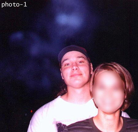 Tim Kruskamp (weeja33@hotmail.com) writes: Photo-1 was taken in July of 1998. My girlfriend (at the time) and I had been seeing each other for about 2 weeks and this was the first photo ever taken of us at a party. It's an outside photo taken at night. You can see an odd smokey looking face above my head and actually in front of my hat. After this photo was taken we had months of poltergeist-like activities in her apartment which was located across the street from the Pioneer Cemetary in Lebanon, Ohio. Things such as: missing and reappearing clothes and other objects, voices, footsteps, a disappearing Bible, toys, such as a silly slammer that must be hit to be activated, were going off all by themselves, terrible nightmares, and even a phone conversation that, at every mention of the ghost, the phone would completely static out so we couldn't hear each other. Eventually it ceased but never completely went away. She and I are no longer together and that's why the face is blurred in the photo... I didn't ask her permission to submit this but I am in possesion of the original photo.