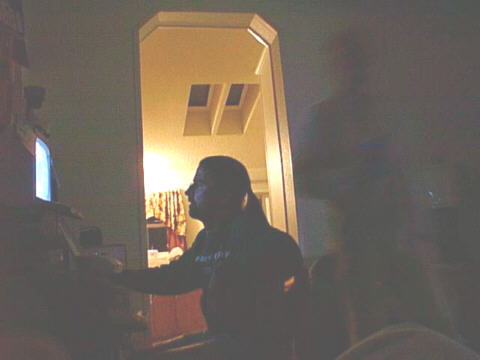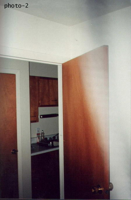 ![]() Photo-2 (Aug 98) was taken in her bedroom while she was at work one evening. I was there alone and heard a voice in the hall that sounded like a TV being on or the answering machine. I went to check it out and found nothing. There was such a sense of evil after that incident that I went and got my camera and took this photo. The room was completely dark when I took it so I used the flash. I was facing the doorway which we both felt was an area of activity. It sounds strange, I know, but I felt there was something there when I took the photo.