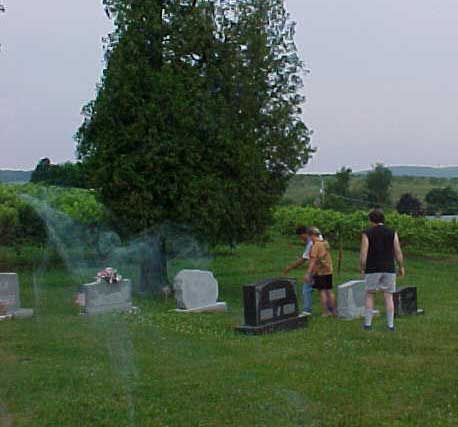Chris Pyle (whaledrivr@msn.com) writes: This picture was taken last year by my wife with a digital camera while visiting my fathers gravesite. When she was looking through the viewfinder, there was nothing there but my mother, myself, and brother. On further perusal at home some hours later, this is what we saw. My father was interred 3 months prior to this visit, and is surrounded by family members.