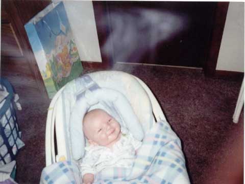 NOTE: Remember folks, we don't insist any of these are real, but are posted for your enjoyment and consideration. We post what the submitter claims. We leave it up to you to decide what is real and what is phoney. Carolyn R Tracy (purplejadetoo@hotmail.com) writes: This picture is of my nephew, He was about 5 months old or less at the time of the picture. We were sitting there just taking pictures to give to family and friends and non of us was smoking for one the child alone gave us the reson not to smoke, two, we were in a non smoking motel room. We didn't see anything at all inĘthe air or in the room before during and after the picture, when I speak of we, I mean my brother and his wife and myself. Of course the child seemed to be looking up and laughing and this is why we took the pic because we couldn't understand it. and wanted to save the moment. Well I don't know exactly what this is. But I have been just recently looking through your site and have seen a photo with this same image on it, scary it is I tell you, this is when I decided I would turn my photo in to you, and get your thoughts. Please contact me about this and let me know your thoughts.