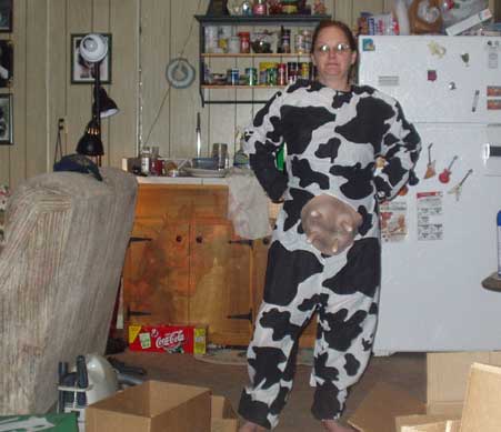 Jason (lethargic@comcast.net) sends us: A few days ago my family were going through some boxes to find stuff for a yard sale. We found this old cow suit and I convinced my mom to put it on so I could take her picture. When we later looked at the picture everybody was laughing at it but me. Everybody asked me what was wrong with me and I was like....well, because I'm wondering what the hell that thing is down there. I pointed to the doors on the cabinet and everybody freaked. It looks like some kind of ghost or a demon coming out from under our sink. After studying it for a while it seems like there is a hand to the left and a hand to the right and a face in the middle. Of course everybody assumed it was a trick with the flash on the wood and I suppose it could be. But if you look closely you can plainly see that part of what looks to be the hand is coming out over the rag that's hanging off the sink. I just thought this weird and freaky. It could be a natural wacky lighting thing of course, but it's still freaky.