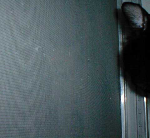 Robyn Juba (ROBYNRAE@prodigy.net) writes: I took this digital photo late at night several months ago. My cat was sitting in his normal spot at the window when he suddenly began hissing and spitting. His tail was huge. I had never seen him so upset. I went outside and turned on the Porch light but saw nothing. I could hear my cat inside still growling and hissing. So I got out the camera to see if perhaps something ghostly was happening. At first when I looked at the photo I didn't see anything. Then I saw the two tiny red eyes and the outline of a cat became very apparent to me. I showed the photo to my landlord the next day. Normally he poo-poo's anything "ghostly" however upon seeing this photo he said he believed it was his cat who was shot and killed last year by the neighbor with a pellet gun. I secretly hope the cat is haunting him! He certainly gave us a good scare!
