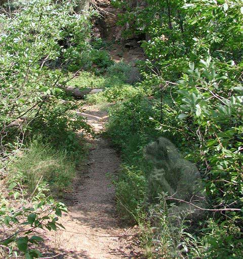 Daniel Badi (dbardi@com-plete.com) sends us: This photograph was taken in Helen Hunt Falls, Colorado on June 22, 2002. I finally got a tripod for my camera as was taking various photos of the forest near a stream. This is one of a path to the west of the stream. I saw nothing while framing the shot, but when I got home... I don't need to explain anymore. What I see is very obviously a human being. This is not a double exposure because it was taken on a digital camera. Please give me your thoughts. I have never seen a ghost before, and would like to have someones professional opinion on what this is.