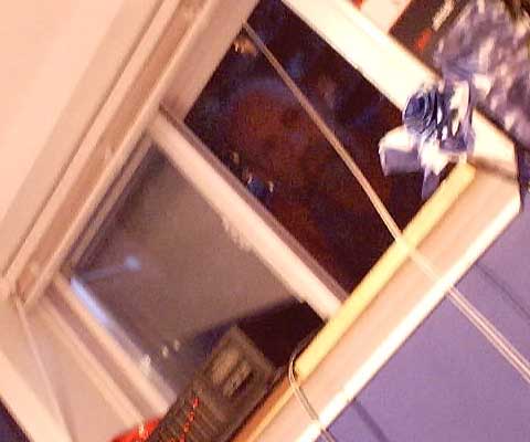NOTE: Remember folks, we don't insist any of these are real, but are posted for your enjoyment and consideration. We post what the submitter claims. We leave it up to you to decide what is real and what is phoney. Paul Bury (paul@grooverince.com) sends us: About a year ago I bough a new video capture card for my computer. After connecting an ordinary home video camera to the computer I just did some test shots of the room. After watching the recorded material I noticed a person in the window. I did not see the person there when I was shooting it. The person stays for 6 frames and then disappears. What do you think is this a legit ghost picture or could it be a lighting or double exposure of the video tape or something. The original picture is very dark and you can hardly see the person. I made it a bit brighter and sharper in Photoshop but that is all I did.