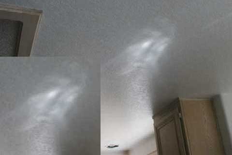 Erika (lady_selphius@yahoo.com) sends us: This is a picture I took of 'something' that apeared on my kitchen ceiling when I came home. (08/03/02) I came home, put down my back pack and went into the kitchen. My cat loves to bother me when I get home so, I bent down and began to tease him with his feather thingie. I hear a light screeching noise, so I look around and as soon as I look up, there it is. I thought Oh my gawd I'm gonna die! I ran up stairs and got my sister. She nearly fainted when she saw it. I had to get a picture so I grabbed the camera and did.