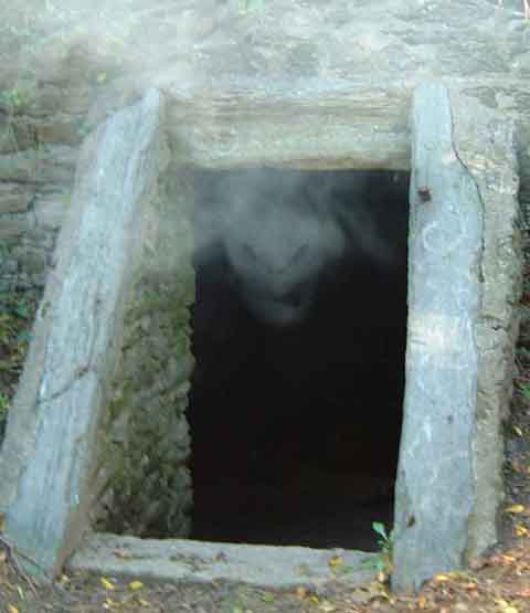 Nik Stamps (CyKoe-Productions@worldnet.att.net) writes: I am a student filmmaker. I am currently working on a historical documentary on my hometown Roxborough located in Philadelphia. I have been filming and taking photos of areas of interest in and around Roxborough. I went for a bike ride in Fairmount Park, which is near by. Fairmount Park is the largest municipal park in the world and is Philadelphia s pride and joy. I was biking in the area named Valley Green, which is a beautiful densely wooded 1,600 acre valley with a creek running through it. When you are in the valley it feels like you are in the middle of the woods miles from human civilization. I biked to a famous cave called Kelpius Cave. It was once the home of a hermit monk named Johannes Kelpius in the early 1700's. He lived in the valley with his dooms day cult, of 40 followers. They were part of the Rosicrucian order. The Rosicrucians are a brotherhood that claims to have secret wisdom dating back to ancient Egypt. I needed to take pictures of this cave because it ties into the history of my hometown Roxborough. Well to cut it short I snapped some three photos of the cave and one of the stone monument marking the cave. Well a few days later when I got the photos back from the photo lab one out of the four photos had something strange in it that gave me chills and haunts my dreams now. In the one photo it looks likes a large cloud of smoke and at the bottom of the cloud is clearly the face of something that s not human. It sorta looks like one of those "gray aliens" I didn't see anything when I was there taking the photos. I scanned up the photos for you to see. I didn't edit this photo in anyway. In this day and age where you can't believe what you see I didn't even want to adjust the brightness/contrast it's totally untouched. It really spooked me. When I was at the cave I didn't see anything but I didn't feel like going in the cave. Thinking back, I just felt that I didn't want to stay too long, it's a strange place. I'm glad I didn't go in the cave because that face was clearly looking at me. Kelpius cave is little known but you can find more information on the web about this strange dooms day cult and it's leader Johannes Kelpius. You can post this e-mail and photos on the web. Thanks art and I love your show it s great.