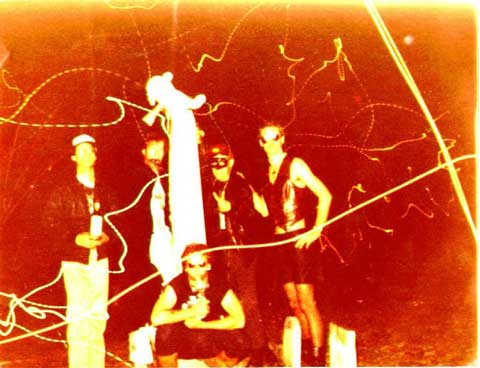 Chris (WHiner8523@aol.com) sends us: When I was in college at DePauw University my friends and I competed in an airband contest. We "played" some Ozzy Osbourne songs, so we thought it would be great to practice our routine in a graveyard. While we were rehearsing, another friend took a picture of us. You can see the mysterious markings on the picture. This picture is unretouched. There were no winds and no bugs in the air that night. Just a calm night in a graveyard -- or so we thought. Could these images be spirits?Ê
