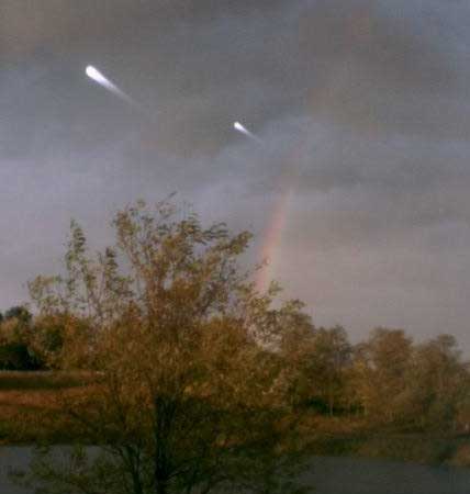 From: "Anthony Keith" tonyandangela@earthlink.net We'd like to submit the following two photos for your review. The first one, with the rainbow, was taken on October 14, 2001 overlooking the north side of our home from the deck. Below you'll notice a pond where we seem to keep getting a lot of strange photos. The second photo was taken November 10th overlooking the same pond at sunrise (trying to capture the golden reflection on the pond). On the second photo, there was NO FOG that morning. I took a total of three photos; the first and third photo shows no fog; however, the second photo shows this "face". The rainbow photo is the sixth photo of about ten. The other photos show nothing abnormal whatsoever. Neither "object(s)" were seen at the time that the photos were taken. What do you think that these can be??