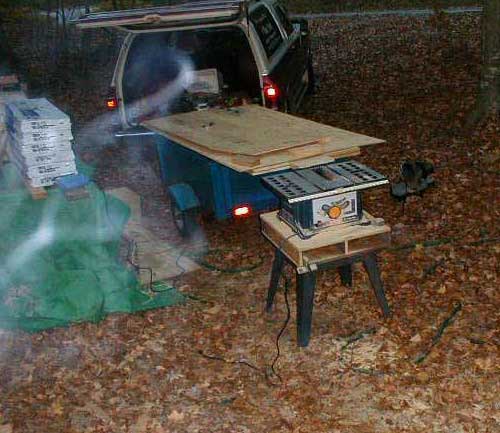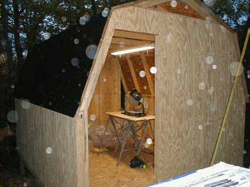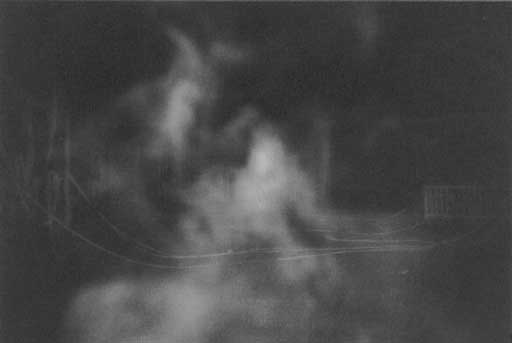 From: Gary N. Took these two pictures on 10/30/01. I am building a shed at my place in central Kentucky. I made this little platform on and old set of table saw legs to hold my new table saw and decided to snap a picture of it before it got too dark outside and then immediately took a picture of the shed I had been working on all day long. I came in and downloaded three pictures off the camera so I could send them to a couple friends on the internet who are following my construction project. I got a cold chill when I saw what the camera caught. I have shown the picture to several people and they think I have captured a ghost both forming up and then dissipating. Didn't go back outside last night after seeing these pictures. The third picture I took in this series was completely clear of anything strange. I have taken hundreds of pictures with this Olympus Camera and never have had it do anything other than than take crystal clear pictures. I wasn't smoking and it was not raining. There was no wind either. Still gives me a chill.