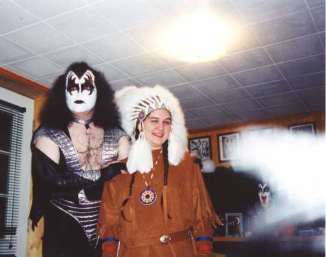From: Teddy Whittenbarger teddy09@bellsouth.net This next photo was taken last Halloween 2000.At a Halloween party at my Apt. I am posing with my friends wife Jessica,Who made her own Costume by Hand I was Impressed.I was thinking about how to pose for the photo when One of my friends took it. I am dressed as Gene Again.what is odd about this photo is the odd shape that looks like it is jumping into the photo from my Hall way. It looks like the shape of a Cat.One of my Cats did pass away in my Apt. years ago. Odd things have happened since that photo was taken and even before it was Taken. I will get to that in a moment. The night of my party I had wittnesses to a strange happening.I had these little figurines in my Kitchen window. One of these figurines was thrown into my sink. Not once but three times! Now when the photo was Taken there was no smoke in my Apt. I asked my guests Kindly to smoke on my porch if they had to. I also had a Fog machine on the porch but not inside the Apt. That's why I find the photo a little strange. Because there was no smoke any were when it was Taken. Long before the party and the photo I have had strange things happening within my Apt. On one night when I first moved into my Apt. On Oct 15,1998 at about 5:30Am. I will never forget that night.Most of my friends do not believe that it happened. But I don't care because I know it did. Because I saw this thing with my own Eyes. I was awakened because I had to go to the rest room.I sat on the corner of my bed. Started to get up to walk to the bathroom. When I saw this Black shape standing in my Hall way. The light from the moon was shining through my Kitchen window it was hitting the figure giving it a glow or a outline. At first I thought this was some one dressed in black that had broken into my Apt and was going to kill me in my sleep. I could not see any features except for the eyes and the outline of the body! The glow from the moon light hitting the form was not blue but a shade of Green. Also the eyes had a shade of green as well. The figure was looking about my Room it did not notice me at first that I was looking right at it. It moved to the side just a little thats when I learned this was the shape of a Woman and not a male. It made eye contact with me. It's eyes began to glow a brite green.I shut my eyes at this point.And said to myself I am not seeing this thing.I opened my eyes and the shape was gone I jump up out of bed turned on my lights. Checked my windows none were broken and I checked my doors they were both locked! There was no way any one could have gotten in with out me hearing them Break in. I hate to say it I left the lights on the rest of the night. Since that night my alarm clock has gone off at strange hours. Now heres the wild part it is turned Off! The Alarm has not been set to go off! I also have this KISS wall clock that runs on batteries.It starts and stops on it's own.It may have a short in the wires I don't know I just leave it alone now and let it start and stop when ever it wants. I have even had a Video thrown at me while watching TV one night last Dec. Nothing like that has happened since. But it was Thrown at me I used my arm to deflect it from hitting me in the face. I'd Say I think my Apt. is Haunted by what I don't know. When I first learned of the Artbell show by a coworker the first night I heard the show Art was Talking about these things now known as "Shadow People" it sent a chill up my spine. I am not sure if this is what I saw that night in my Apt. But it sort of fits the description of it. Every now and then something strange happens in my Apt. But I hardly pay any attention to it now. But the photo tells it all wouldn't you say? The object has freaked some of my Friends out after seeing it.