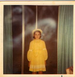 StreetThunder (StreetThunder13@cs.com) writes: This is a photo of my sister from the late 60's. I saw this picture that appears to have several figures around her. On the left side of the photo you can see what looks like a mouth wide open with large teeth. I have no idea what it could be.