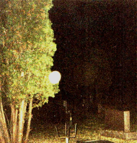Mark Waldenberger (ghosthunter@consultant.com) writes: In this photo, you will see a very bright orb in front of a pine but the really exciting part is to the right of the bright orb. If you look closely, you can see what appears to be a form coming together from another much larger orb to the right of the bright one! I didn't notice it at first until a couple of our members brought it to my attention and sure enough, I saw it too! There appears to be a torso forming complete with arms, shoulders and midsection but no head or legs can be seen. We have suspected for some time that the spirits at this particular site may well be ready to take our contact to the next level and this could well be the first sign that it is going to happen!