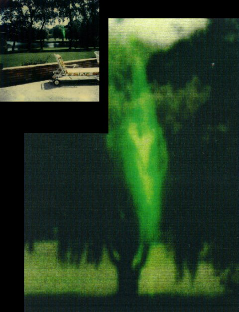 Paradisian (paradisian@ureach.com) writes: This photo was taken by my friend Lynn Marks around 1982. It was taken in the Barrington Estates area, suburb of Chicago. Lynn saw only the lake and trees through the viewfinder of the Polaroid instant camera she was using. When the photo was developed in the next minute or so, this amazingly detailed image appeared on the photo. The image is so tiny and so detailed (human form), and you can clearly see eyes, nose with nostrils, mouth, what looks like a moustache, scraggly beard, long curly/wavy hair, neck bones, shoulders, pectoral and solar plexus muscles, foreams with biceps, elbows, forearms, wrists, five fingers on the left hand and a least three visible on the right hand which is turned sideways against the thigh, thigs, knees, perhaps even genitalia, and calves... trailing off at the knee.