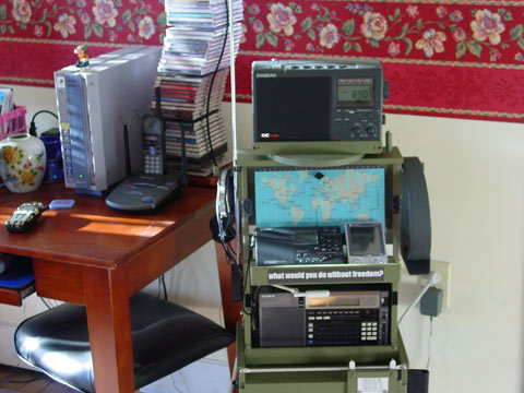 Gary Thorne (garythorne@kconline.com) shows us: I made this unit for my radios. The CC radio sets on top with a turntable to tune in those long distance stations... The pocket pc tracks my radio frequencies.. and all extra equipment hangs from the sides.... headphones, terk am ant. and my Sony 2010 for sw. This unit can be pulled from room to room. The bottom of cabinet holds my sony MD recorder for those ART Bell nights!