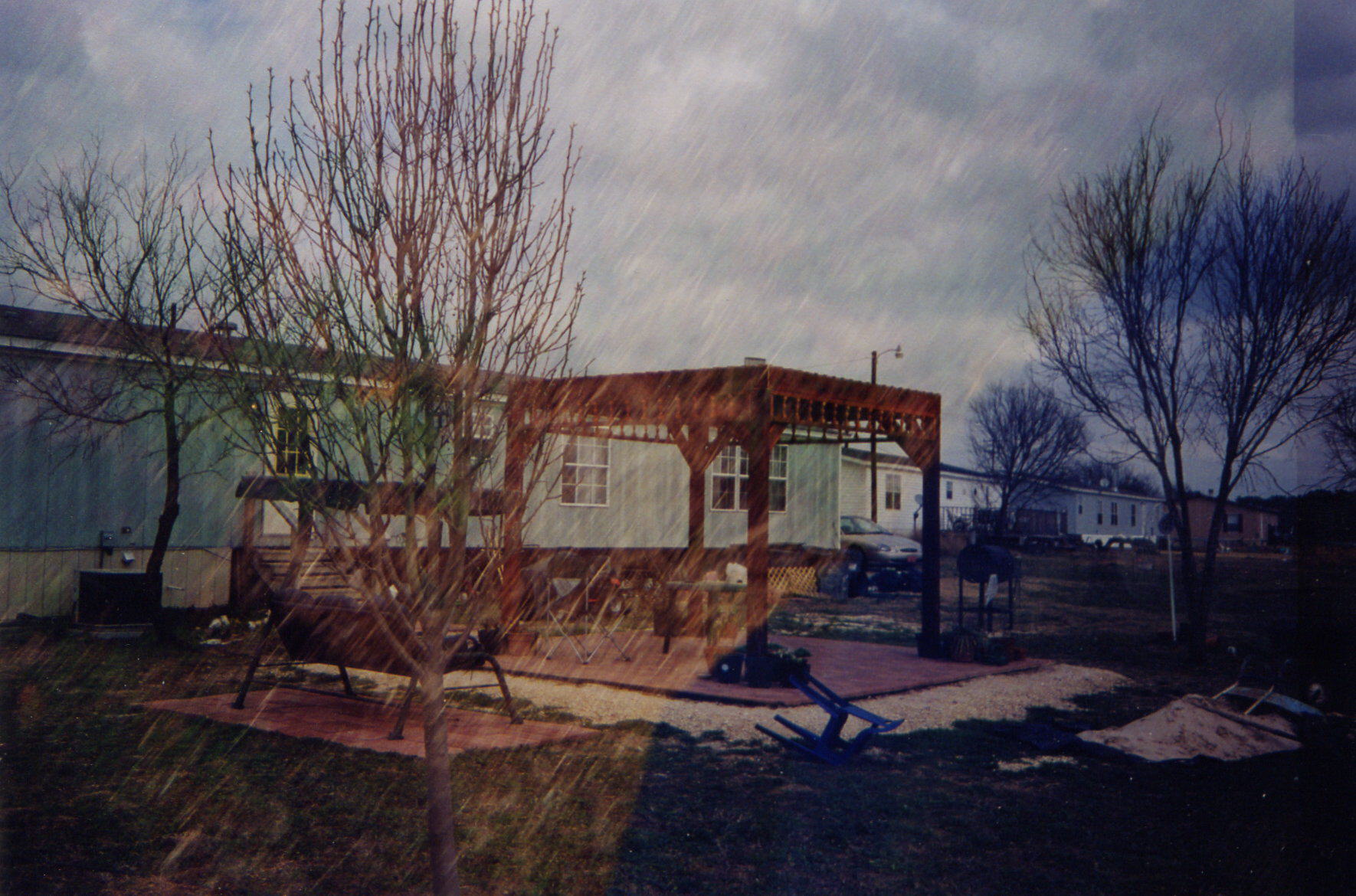 Shannon Mahalko, San Antonio, TX (honeybearis@msn.com) askes: This picture was taken in our back yard in Jan. of 2002, on an overcast day in San Antonio, TX. There was no rain, just clouds, and nothing in our backyard that we could see. We were wondering if anyone might have a suggestion as to what the yellowish area that looks like rain might be. Anyone seen anything like this before? We would welcome any feedback someone might have. Thank you.