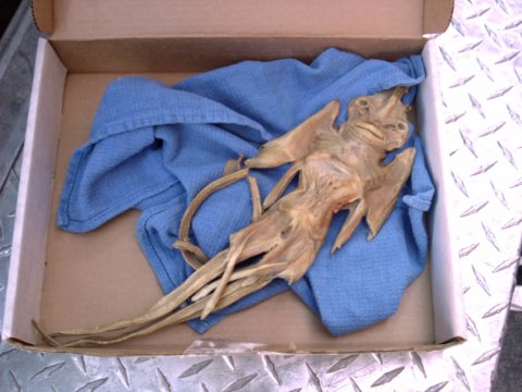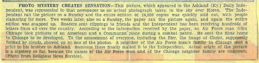 eddie g. (nickel.master@verizon.net) replies: I saw your picture on Art Bell's web site (ABOVE),and I don't know "where" you live, but in the state of Florida we would catch one of these on rare occassion, down there they're calledĘ "devil fish" the last one I caught was about 16 years ago on the east coast of Florida in a town called [Merritt Island] just off docs bait house, "looks like a cross between a cat fish,and a squid (lower half) in my opinion" ; the east seminol indians of that area said it was bad luck to catch one as they were not your everyday fish but were thought to be of the devil to scare all the other fish away when the great spirit was angry with thier tribe!! Thus the name devil fish, they are very rare, and I've only seen 3 in my entire life, too see 3 at once is highly unccommon, at least in Merritt Island Florida anyway, if you think they look wierd dead you should see them alive on the end of your fishing line, it will definitly give you the creeps catching something like that!!! I just cut my line 16 years ago, and didn't touch the damn thing; the water I caught it in is what they call brackish water [or half salt water, half fresh water] water comes in from the ocean through the inlet where sail boats come in to the fresh water of the river itself in that area; and that area was popular with the indians because hurricanes would make the least damage in that area of Florida than any other part of Florida, if you look at a map of brevard county you can see why; first area hit was Cocoa Beach, then the "bannana river" then the 50 mile long merritt island, then the "indian river" before hitting the mainland of cocoa florida, so everytime the hurricanes would go over a river they'd slow down to pick up more water from the river slowing the hurricanes winds down twice before hitting the mainland!! Causing less descruction... until the 1950's it was common site to see flying fish too!!! My dad told me stories of not even being able to fish due to the decks of the boats getting covered with flying fish!!! And mosquitoes so bad if you went out at night your arms would turn black within 2 minutes due to so many mosquitoes covering them up!!! he said you could take your hand, and wipe off one arm to reval your arm covered red in blood!!! [Now they have mosquito trucks ther that spray every night to keep them down]!!! It is also said that the kings of the waters often fight over the brackish water (sharks attack alligators, and vise versa in that water) imagine watching that on the nature channel!!! Anyway I don't know the scientific name for the devil fish but that is what they call it in Florida.. Hope this information enlightens you a little. Rodney A. Duplisea (FansFla@cs.com) Bangor, Maine writes: I found this newspaper clipping in my mother's scrapbook. She had clipped it from the Bangor Daily News, in Bangor Maine during the Korean War. Possibly, you have seen this before. When I saw this clipping, it made me think so much of your show.