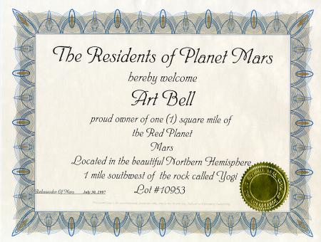 Art receives a deed for property on the planet Mars. Let's hope property