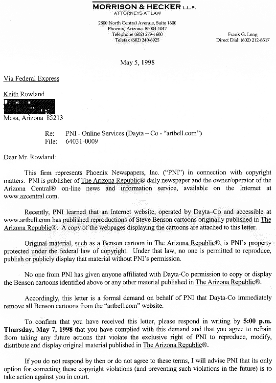 Here is a letter from Phoenix Newspapers, Inc. lawyers, demanding we remove the Steve Benson cartoon from the web site. Apparently it's OK for Benson to smear Art Bell in the newspaper, but Art can't post it on his web site. Also see Our View of Benson.