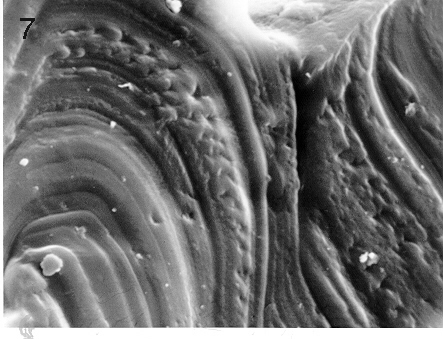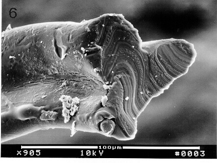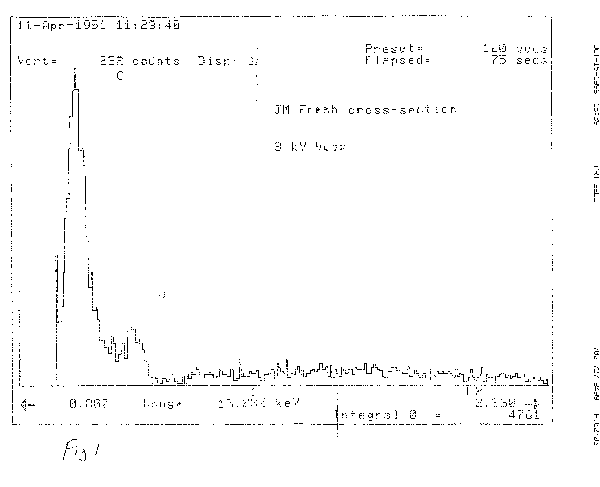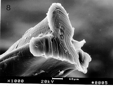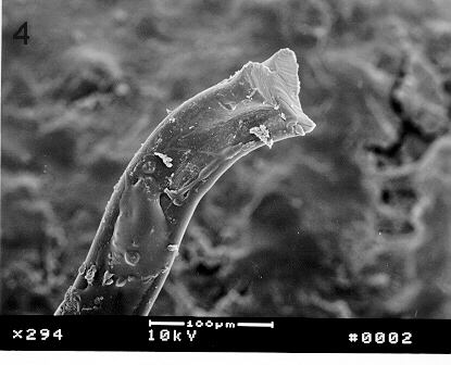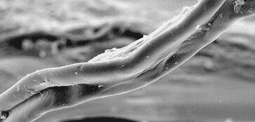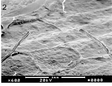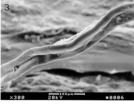 A piece of the object was sent for analysis by scanning electron microscopy (SEM). Using the SEM for energy dispersive spectroscopy (EDS) showed the specimen to consist primarily of carbon and oxygen, with carbon being the dominant element. This was the case for measurements made outside as well as inside the specimen (See Figure 1); measurements at several locations on the outside surface also showed the presence of small amounts of a complex mixture of elements consisting of those characteristic of tissue and contaminating substances(e.g. sulfur, chlorine, silicon, aluminum, etc.) Using a sharp scalpel the fiber was sliced into two segments and coated with a gold film to enhance imaging with the SEM . Figure 2 shows the two separated segments; the distal ends are attached (glued) to the support stub, while the cut ends are extended (facing each other) above the stub. The three-lobed nature of the wire-like fiber is readily evident in Figure 2, Figure 3 and Figure 4. A higher magnification of the surface is seen in Figure 5. Here the presence of a film surrounding the specimen is evident, and there are attached cell-like structures some of which have an appearance and size consistent with that of red blood cells. The most interesting features of the specimen are represented in the cross-sections seen in Figure 6, Figure 7 and Figure 8, where a series of thin layers only a few microns thick are organized in an irregular manner. Figure 7 is a higher magnification view of the cross section of Figure 6; here some of the layers have a braided-like appearance.