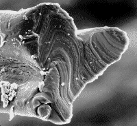 A piece of the object was analyzed for its 13C/12C carbon isotope ratio by Krueger Enterprises, Inc. (Cambridge, Ma.). The ratio was found to be 0.01092 which is only slightly lower (1.496) than the value listed in the Merck index for terrestrial carbon which is 0.01108. Conclusions: The specimen appears to be an organic, plastic-like, three-lobed fiber with an internal structure organized into intricate layers in a seemingly irregular manner. Its identity, function, and purpose remain unknown at this time. Transcribed from the original report received by Art Bell. |