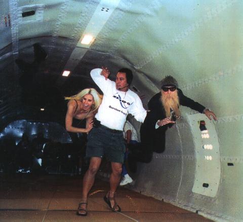 Learning to Fly, Strip, and Vomit on a 727Penn JilletteSince I was a kid, I've wanted to be weightless. I really wanted to go to space, but part of going to space was being weightless. Just to hold something up in front of me, and have it stay right there is the idea of magic. As I got older, I battled gravity. My start in showbiz was as a juggler. Jugglers fight gravity. The hack jugglers cover a drop with a "standard" (meaning it's been stolen so much, those who didn't write it conveniently consider it to be public domain) 'cover' (it doesn't really cover very much, they know the prop is on the floor and they know you're chasing it, bent over like you're chasing a duck) line, "Sudden gust of gravity." Now, that I'm 45 years old and I weight 280 pounds, gravity is a less sporting and more real enemy. I'm 6'6" tall and I still remember Leslie Fiedler writing in "Freaks, Myths of our Secret Selves" that "gravity is not kind to those who grow too large." As we get older, it seems the jockey build is healthier. No one knows what gravity is. I mean we just don't know. There is no good theory. A good theory in science is one that we're damn sure is true: The Earth goes around the Sun. Evolution is how we got here. No one seriously doubts those. But, gravity, well, we just don't know. So, right now, the only way you can feel weightless for more than a couple rollercoaster seconds is by getting far enough away from Earth, or taking the Vomit Comet. The Vomit Comet is how NASA trains astronauts (the Russians must do it too, right?). They take a big old airplane and they go up and down really fast. When they go up, you weight 1.8 times your weight, and when they go down, you weigh around 0. The FAA has always given NASA a monopoly on losing all your pounds of ugly fat (along with muscle, bone, and everything else). Astronauts get to ride it, some scientists get to ride it, and that's about it. Ron Howard made some backroom deal (it MUST have included sexual favors) to be able to shoot "Apollo 13," on the NASA Vomit Comet and they talked about it a bit, but it was soon quieted down. You're not REALLY supposed to use a government-funded program to make movies. Not really. I mean, I'm glad Tom, Gary, and Kevin got to fly, but if everyone really thought about it, why can't we all ride? A couple free-market nuts at NASA decided they LOVED Zero G, and it was time to get off the socialist tit, and buy their own Vomit Comet and start selling rides on it. Everything the Vomit Comet does in within the specs of planes, and why can't we do what Ron and Tom got to do? That was the idea. When they first got this harebrained scheme, I heard about it. It seems that when anyone gets a harebrained scheme, I'm CC'd on the memo. I loved nuts, I'm for nuts, I am nuts. They all get in touch with me. I told them I thought it was a great idea (and you know how much that means), and I wrote them email, gave them tickets to our show, and went to dinner with them a couple times. They were going to get approval to fly a 727 very fast right straight down very soon. It was going to be a matter of months. That was 6 years ago. But, I kept talking to them, and whenever they gave me a date, I said I would be there, until it fell through again. Us free-market guys are always fighting the man. Well, they finally fought the law and kinda sorta won. They at least won enough for me to fly. I finally did it. After 6 years of grueling cheerleading, I got be be weightless. Only about 600 people in the world have felt the feeling. And as I sit here in my office at home, my body knows something it never knew before. It knows how it feels to be weightless for more than a second or two. And I feel it. I feel it every now and again. Just sitting here, I have the feeling in my whole body, that I might be able to just float away. I might be able to just take off. My Zero G buddies tell me that now my body knows, I'll have astronaut dreams. I will dream of floating and flying. I'm a different person. I'm old and huge and I have very bad eyes, it's unlikely I'll get into space for real -- but, I've been weightless, and now my body knows something it didn't know. I know what it feels like to weigh nothing, and I know that all the way through. It was not without price. I had to get up early. We've been working hard on my show for the Sci-Fi Channel called "Fi-Sci with Penn Jillette, the Fiction Science Show," and I needed a rest, but I got up early in Vegas and caught the 8:10 to Burbank. Getting up, wasn't hard. I was as excited as a little kid and didn't sleep anyway. I decided to have a Cinnebon ("You pig!") for breakfast because I thought it might taste nice coming back up. I slept the whole flight to Burbank. I went from Burbank to Van Nuys by car. These buddies of mine from NASA, Ray, Bob, and Peter, with a former astronaut, Byron, are the guys that started Zero G, a company to make the Vomit Comet available to the public. They met Billy Gibbons (of ZZ Top) in an airport and got him on the same jag as me. He's also a guy that cheerleads for nuts. Look at us for christ's sake. He was going up too. This was not a public flight. This was to get the pilots better at hitting perfect "Zero G" and try out the plane. On board would be two pilots, Ray, Bob, Byron, and Peter. There were also going to be a flight doctor, a nurse, and two paramedics. Peter's girlfriend, who is a platinum blond, way big after-market breasted women in who works in nuclear medicine dressed VERY oddly for space was going for her first ride. And then there was Billy, and me. That was it. Billy, Sandra (the blond), and I were on the manifest as employees. Hey, we are employees. We've been cheerleading for 6 years. So, there was Billy, big as life, with the big old Warner Brothers cartoon hillbilly beard, an African hat, a $250,000 Gibson starburst, a 6 pack of beer, and a specially made amp. The amp was made in a can of peanuts. He looked great. Billy is thin. Shaved he would