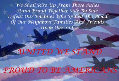 ToriSterling@aol.com sends us: My husband and I made this to send to friends and family to show our feelings and suport. Hope you like it. ![]() Even More Patriotic Responses to 911 Attack |