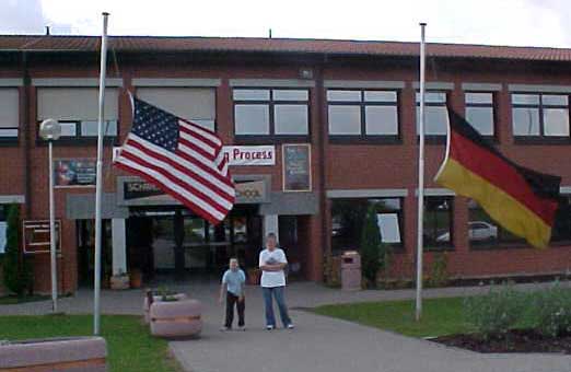 A picture of the U.S. flag and the German flag flying at half mass in front of my