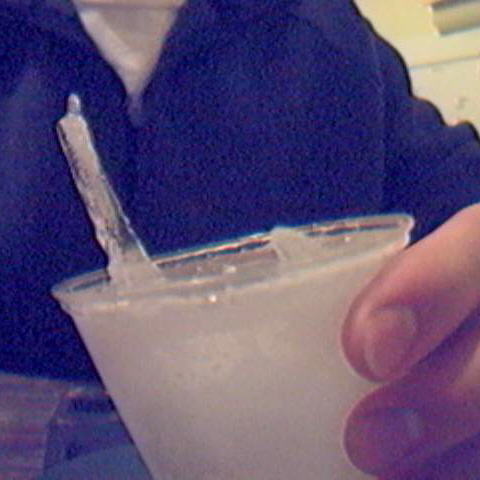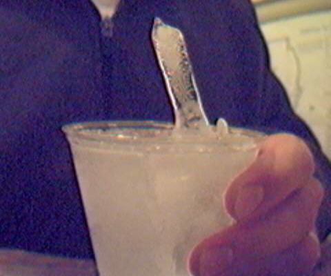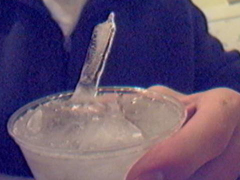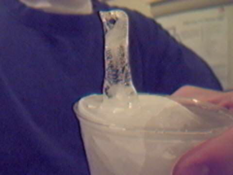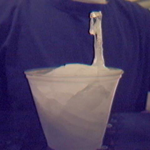 Hakan Sayar, Fort Lewis, WA (hakan-sayar@us.army.mil) sends us: I place a clear plastic cup of distilled water in the same location in my freezer and in twelve hours I normally find frozen water that rises no higher than the rim of the cup. However, lately the water has frozen in these odd shapes as if to somehow defy gravity, by producing bold and spiked columns. I cannot seem to duplicate these results at will. I am at the mercy of the freezing process. Note: nothing hangs near or over this cup to influence any capillary action while freezing.