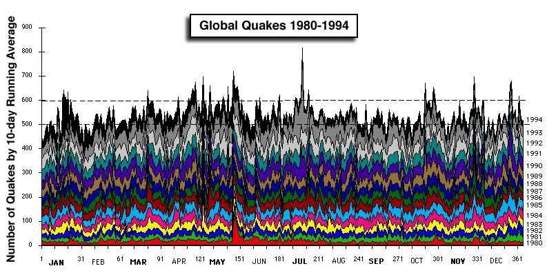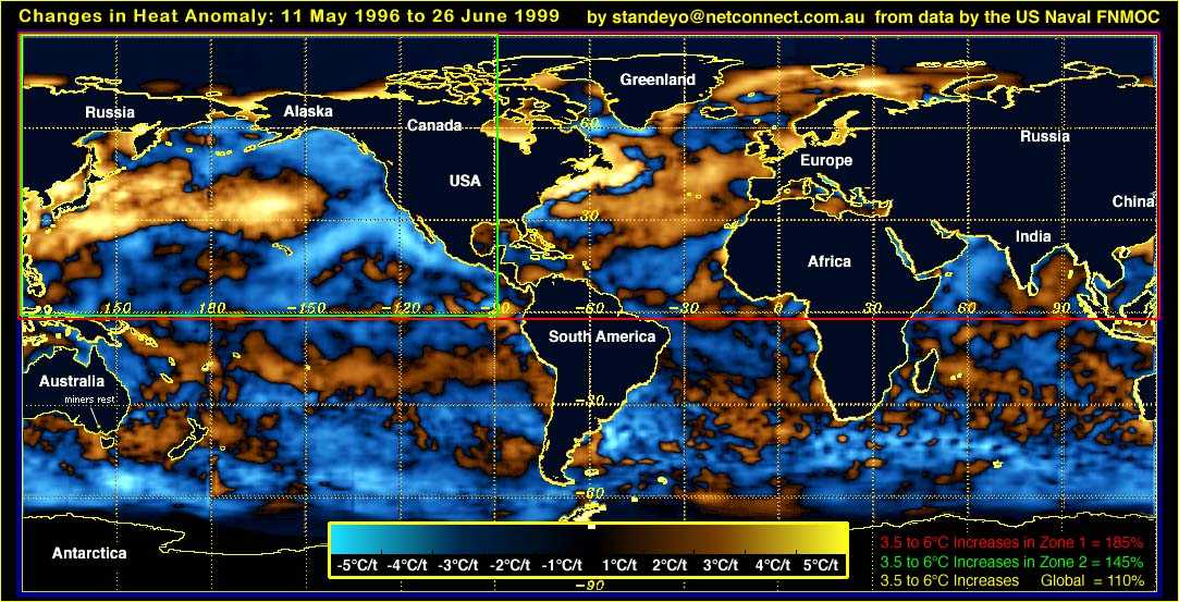| Disaster Warnings 27 June 1999 SOLAR ERUPTION THREAT: The Sun is exhibiting major anomalies as we write this! There at least SEVEN sigmoid plasma filaments connecting hot sunspots across the Sun's equator and FIVE of these filaments are on the approach to an Earth-impacting release point. This means that Earth could receive a major solar wind impact caused by one or more CMEs between four and 12 days from now. The sunspot number is over 310 at present! This scenario could very well collapse several satellite comm systems and a lot more.... NEW Global Weather Threat: We have been watching the sea surface temperature variations for over three years. In the three months a pattern of considerable size and significant temperature above the norm for the region has developed around japan and has formed an arm pointing into the west coast of America. The area of this heating pattern is already equally as large as the one which prompted me to warn Americans over the Art Bell Radio Show of a severe weather pattern (an el nino) back in April of 1996 - a full two months before the official warning was made public. I have constructed a comparison of the Jan 30 patterns from 1996-1999. These show you the changes of patterns. Because of the severity of the droughts, floods, storms and hurricanes which it will cause, this year's pattern might later be remembered as, "El Diablo!" I am particularly concerned over the size and location of this "El Diablo" heating anomaly. It is appearing in both the North and the South Pacific sectors and an extension of it appears to be forming off the upper coastline of Eastern America where it joins Canada. Compare the OTIS Anomaly Maps for 26 June 1999 and 11 May 1996. The INCREASES in global heating anomalies in the sea surfaces show disastrous weather until after the end of this year... to this century... to this millennium... Using the accompanying Comparative Graphic Map of the current (26 June 1999) OTIS Anomaly map and that of the beginning of El Nino (11 May 1996), you will see that there are three zones of comparison. Zone 3 (yellow border) is the entire sea surface of the planet; and it shows that the anomalous heating of the region has increased by 10% in the range of 3.5-6 degrees C -- when compared to the anomalies of May 1996. Zone 2 (red border) is the entire sea surface of just the north Pacific ocean; and it shows that the anomalous heating of the region has increased by 45% in the range of 3.5-6 degrees C -- when compared to the anomalies of May 1996. Zone 1 (green border) is the entire sea surface of just the northern hemisphere;and it shows that the anomalous heating of the region has increased by 85% in the range of 3.5-6 degrees C -- when compared to the anomalies of May 1996. All this data indicates the following conditions for the next 12 months in varying degrees: 1) Drought or unusually dry conditions: Japan, Alaska, most of the USA (some wet weather may occur in Nevada and south of there; and also, some summer storms may hit Florida coast and slightly north of there), most of Canada, Iceland, Europe, western Russia, Scandinavia, Central and southern Australia, New Zealand, New Guinea, Fiji, 85% of Africa, southern Greenland 2) Ice melting with some flooding: Due to the increases in the thermal anomaly in the northerly latitudes, I suspect we will see increased polar ice melting in Siberia, Greenland and in northern Canada and Alaska. 3) Super rain-bearing storms in northern Australia (especially from Darwin to Gulf of Carpentaria), Southern California, Washington and Oregon, western Canada, India and Bangladesh. I suspect the NW USA, India and western Canada will get the worst storms. NOTE: These are my unofficial estimates based on the images I have shown you here today. I reserve the right to be wrong.... I have made these estimates by determining where warm, moist air masses would collide with cooler air masses; and would, hence, dump precipitation. Also, I have looked at the thermal heat engine values to see where the most violent winds might be created. -Stan Deyo 27 June 1999 Quake "Windows" are periods during any given year when seismic events of a significant magnitude are more likely to occur than during adjacent periods of the year. To this end, I have compiled a stacked plot of 15 years' worth of seismic events so that we could see the peaks and troughs of seismic activity. The peaks are not necessarily the most likely 'windows'. The most likely windows are those days whose numbers are high and whose colour bands are fairly consistently taller than the neigboring days.... As you can see, one superquake which produces several hundred aftershocks can distort an entire coulumn of data making it appear to be a high probability window. The latest forecast of terrestrial magnetic storms (Ap Index Forecast) caused by all solar particle emissions including coronal mass ejection (CME) events predicts a seven-year period of intensifying magnetic storms starting now. To clarify the function of the Ap Index, K variations are all irregular disturbances of the geomagnetic field caused by solar particle radiation within the 3-h interval concerned. All other regular and irregular disturbances are non K variations. Geomagnetic activity is the occurence of K variations. Kp and its related indices (ap, Ap, Cp) have been widely used in ionospheric and magnetospheric studies and are generally recognized as indices measuring worldwide geomagnetic activity. - Stan and Holly Deyo |
