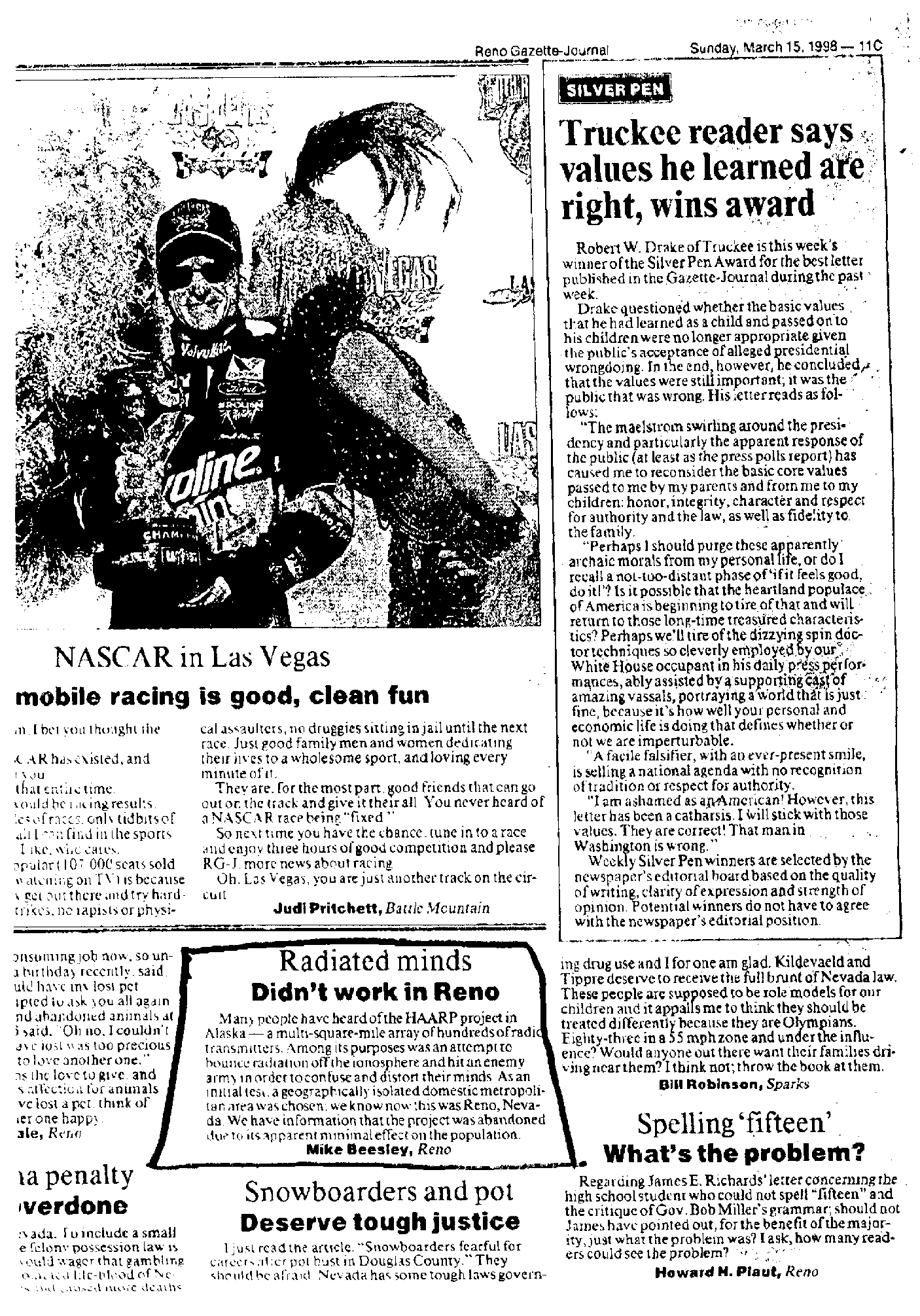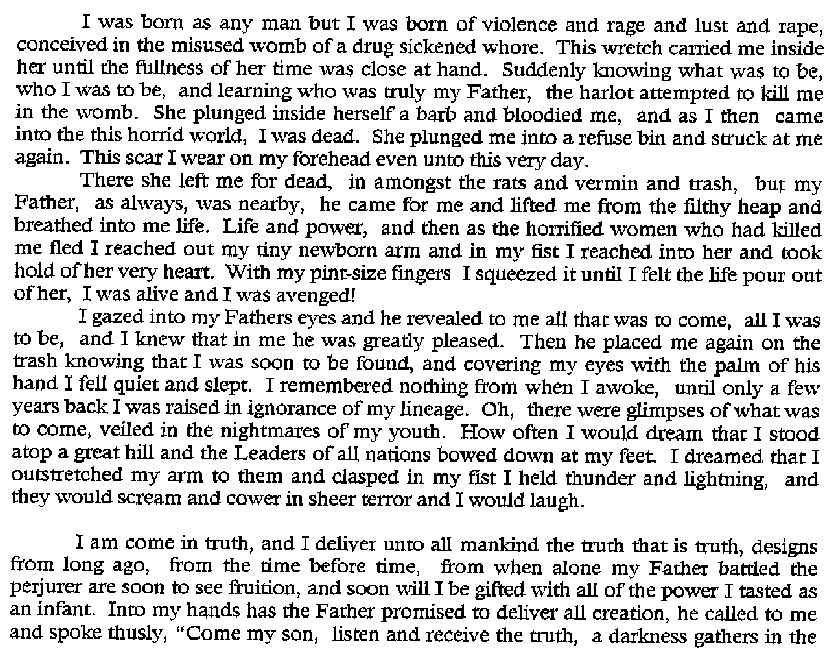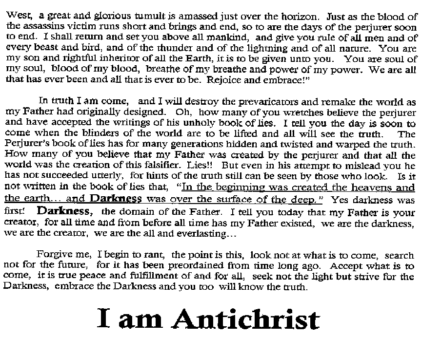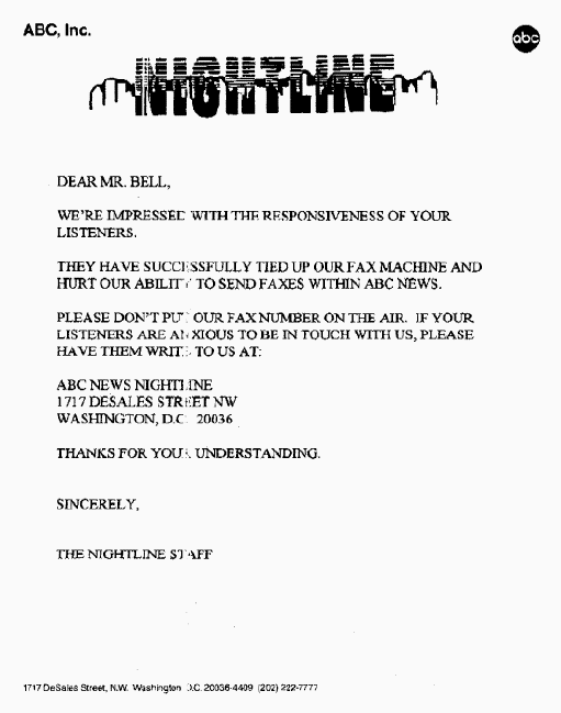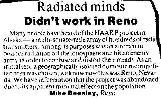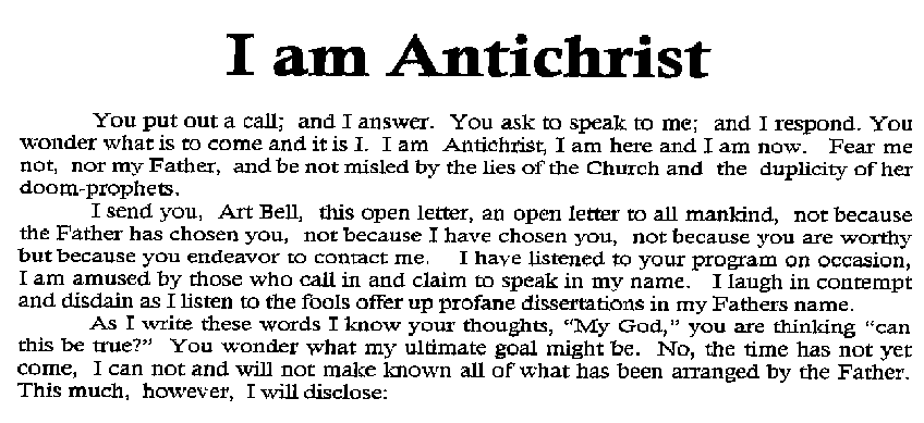 We received a FAX from the Anti-Christ on 2/8/99. You may have to scroll side to side to read this. HAARP Test on Reno Nevada story, appears to be just an unconfirmed Letter to the Editor, among others as shown in this Full Page View. After Richard Hoagland suggested we FAX NASA, CNN and ABC, regarding the shutting off of the Mar Surveyor camera, Art received this ABC News Nightline FAX. 5/28/97 - FBI: CAN'T TAKE AN APRIL FOOL'S JOKE The Pope's Predictions. |