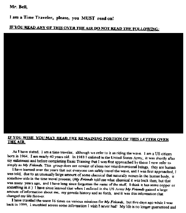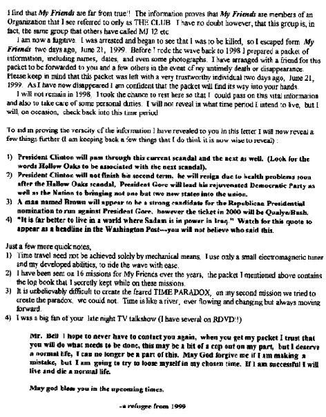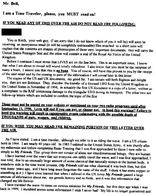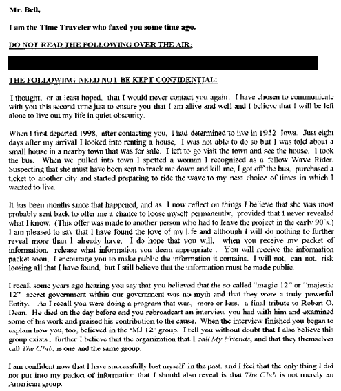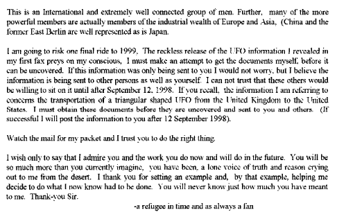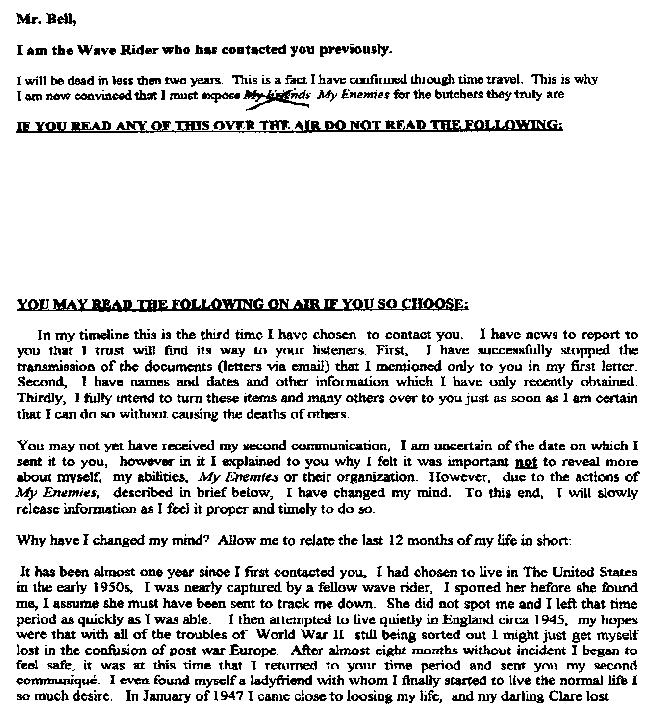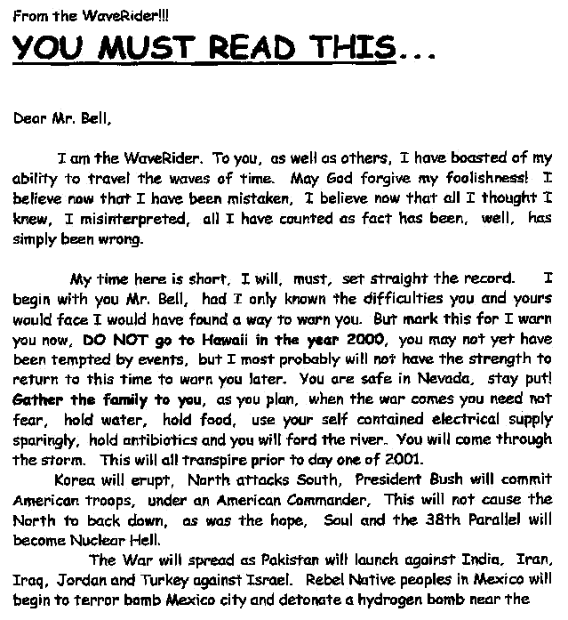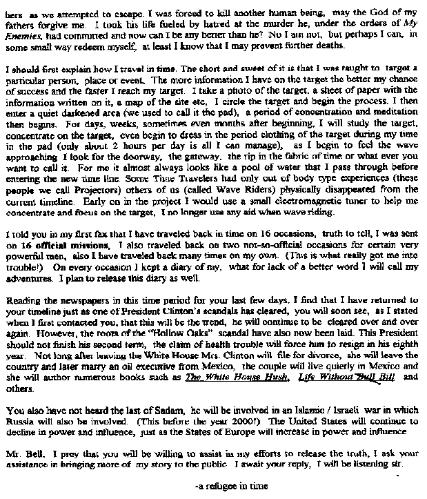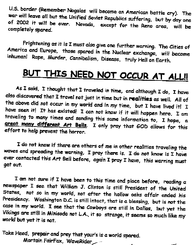 The Wave Rider checks in after a long departure. See the previous contacts listed below these new ones. (Webmaster Note: Please forgive the Fax of a Fax conveted into a GIF file. It's ugly but readable. We've got to get the Waverider an email account!)We received the first FAX on Feb 26, 1998, from a claimed Time Traveler who rides the wave! Portions edited by request. A second Fax was received April 3, 1998, but might be the third of the series. Then we received a third fax, which may indeed be the second message. Finally, the first fax is revealed due to the news report from the Daily Mail.